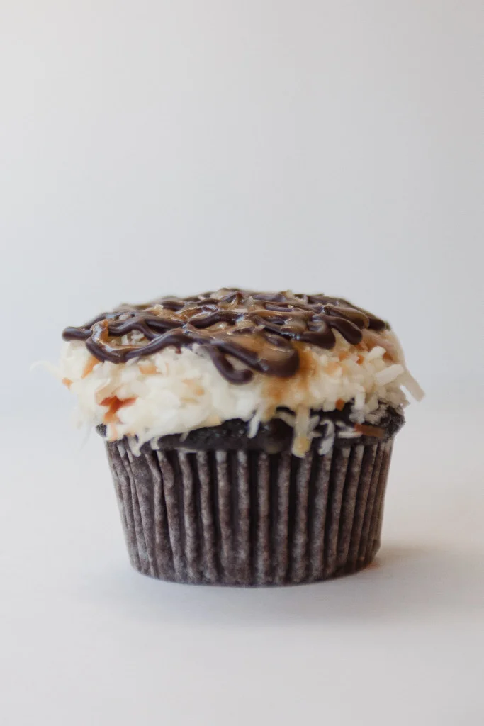 Chocolate cake with vanilla cream cheese frosting, coconut shavings & caramel
